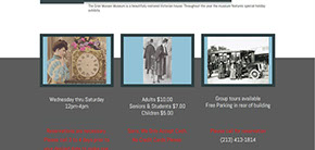 The Grier Musser Museum is a turn-of-the century historic Queen Anne house which displays fascinating antique collections in monthly holiday exhibits throughout the year. Visiting the Grier Musser Museum is educational, as well as, entertaining. As a visitor, you will be greeted at the door and shown the architectural features of the house, such as, the intricate woodwork. The museum is located near downtown Los Angeles and close to the new Red Line Subway Station. There are many historical sites in area around the museum, such as, Olvera Street, Union Station, Angelino Heights, and West Adam's Historical Homes. Other places of interest near the museum are Chinatown, Little Tokyo, IMAX theater, the Bradbury building, the newly restored Central Library, L.A. Convention Center, Angel's Flight, Queen of the Angel's Cathedral, New Disney Hall, and the Japanese American Museum.